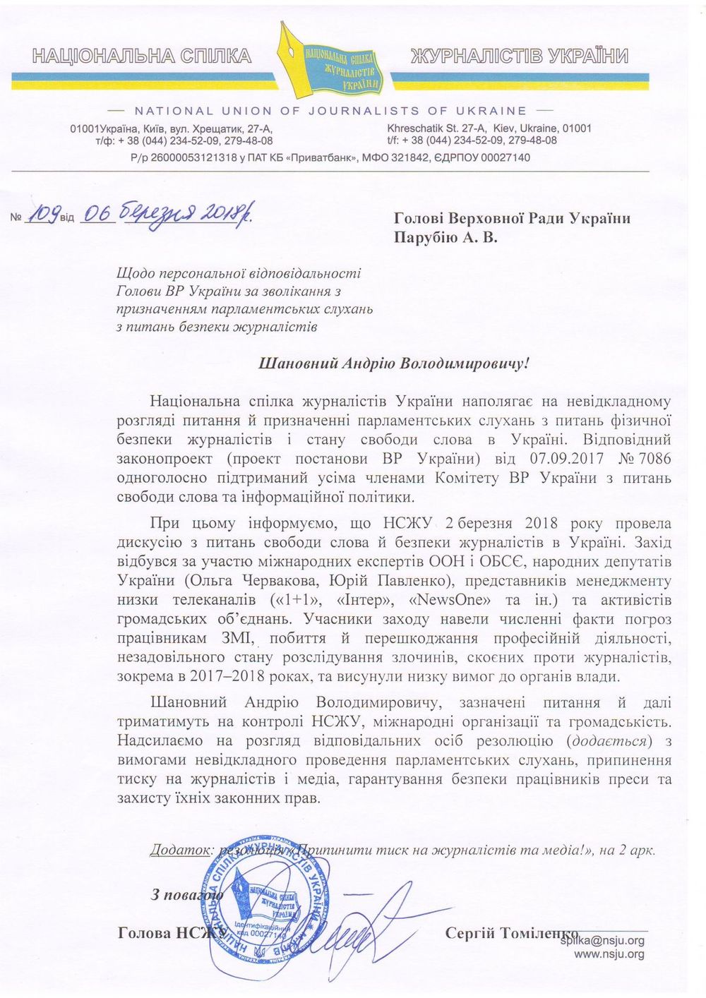 Письмо НСЖУ подготовлено после принятия резолюции "Прекратить давление на журналистов и медиа" по итогам публичной дискуссии "Угрозы свободе слова в Украине", проведенной Национальным союзом журналистов Украины в партнерстве с Международной федерацией журналистов 2 марта.
