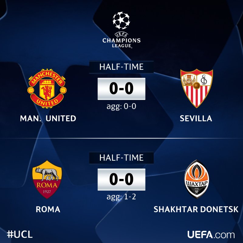 22:34 В параллельном матче в Англии Манчестер Юнайтед  и Севилья "просто дружат". Ни одного гола пока в их паре. Первый поединок в Испании завершился 0:0.