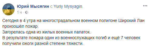 "Сегодня в 4 утра на многострадальном военном полигоне Широкий Лан произошел пожар. Загорелась одна из жилых военных палаток. В результате пожара один военнослужащий погиб и еще 7 человек получили ожоги различной степени тяжести", - написал волонтер.