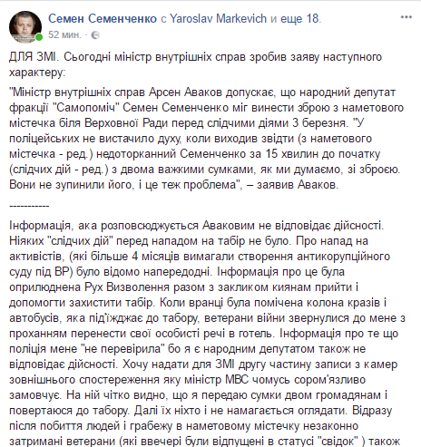 "Информация, которая распространяется Аваковым не соответствует действительности. Никаких "следственных действий" перед нападением на лагерь не было. О нападении на активистов, (которые более 4 месяцев требовали создания антикоррупционного суда под ВР) стало известно накануне. Информация об этом была обнародована Рухом Визволенняя вместе с призывом киевлянам прийти и помочь защитить лагерь. Когда утром была замечена колонна КрАЗ и автобусов, которая подъезжает к лагерю, ветераны войны обратились ко мне с просьбой перенести свои личные вещи в отель. Информация о том, что полиция меня "не проверила", потому что я являюсь народным депутатом также не соответствует действительности. Хочу предоставить для СМИ вторую часть записи с камер наружного наблюдения, которую министр МВД почему-то стыдливо умалчивает. На ней отчетливо видно, что я передаю сумки двум гражданам и возвращаюсь в лагерь. Далее их никто и не пытается смотреть. Сразу после избиения людей и грабежа в палаточном городке незаконно задержаны ветераны (которые вечером были отпущены в статусе "свидетель") также попросили меня принять на хранение их боевые шевроны. Причины подобных просьб - постоянная кража личных вещей и срывание боевых шевронов "Беркутом" (во время предыдущих штурмов палаточного городка с октября 2017 года)", - написал Семенченко.