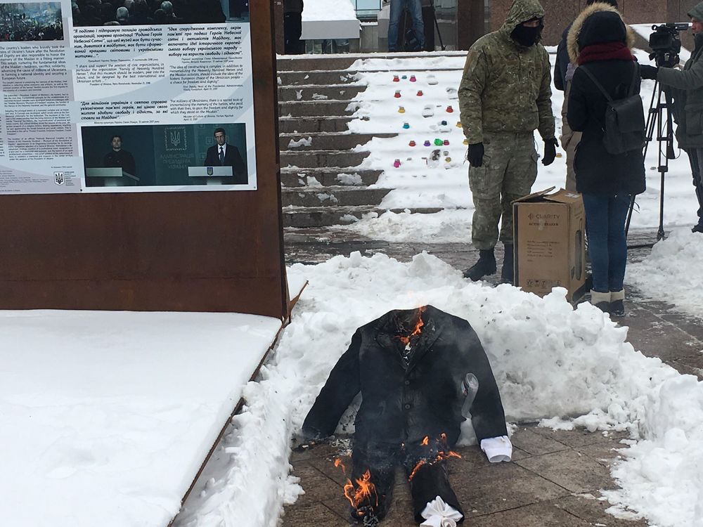 11:43  На Майдане у монумента независимости сожгли чучело Путина, сообщает корреспондент "Страны". Это символический акт организаторов и участников акции "Мне болит Крым". У монумента собралось до трёх сотен активистов, неподалёку люди с плакатами "Руха новых сил". Их акция запланирована наМайдане на 12 часов.