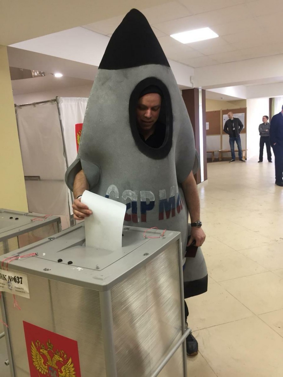10:45  В Ленинградской области избиратель явился на участок в виде межконтинентальной баллистической ракеты "Сармат".