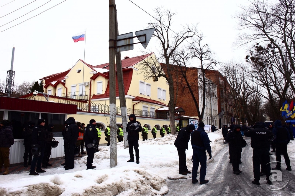 Также агенство сообщает о том, что в городе оцеплено консульство России, у которого так же, как и в Киеве, собрались националисты и принесли чучело Путина.