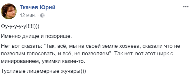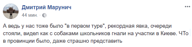 "А ведь у нас тоже было "в первом туре", рекордная явка, очереди стояли, видел как с собаками школьников гнали на участки в Киеве. Что в провинции было, даже страшно представить", - пишет Марунич.
