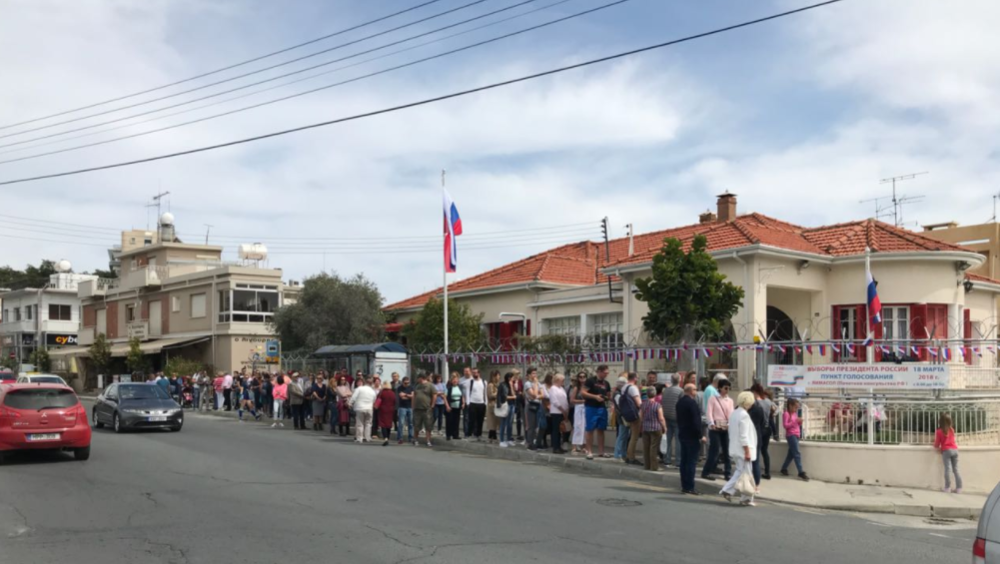 14:07  Уже две тысячи россиян проголосовали на Кипре. У посольства - очередь.