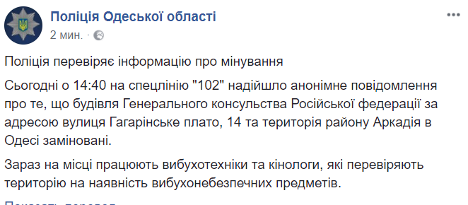 15:31  В Одессе - еще одно сообщение о минировании российского консульства. В первый раз его "заминировали" с утра.