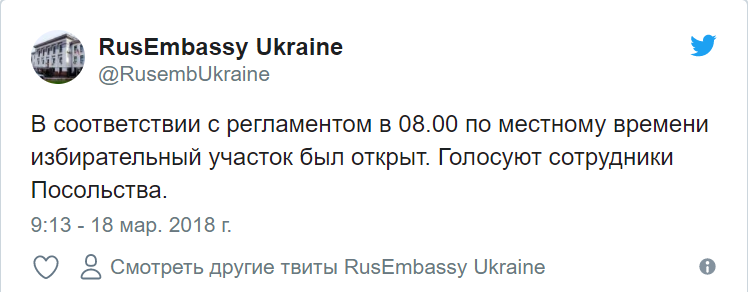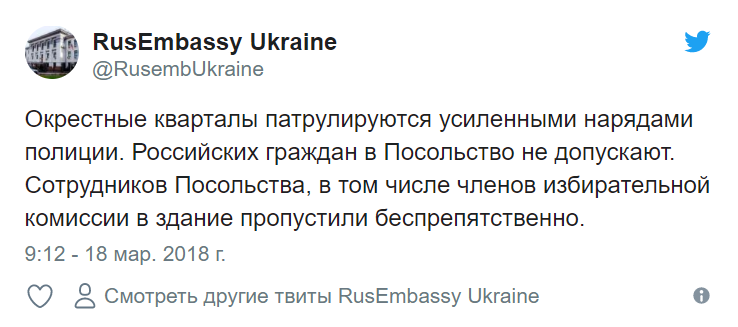 9:39  В российском посольстве в Киеве прокомментировали ситуацию с выборами. Говорят, что избирательный участок открыли, сейчас на нем голосуют сотрудники дипмиссии. Остальных граждан РФ на территорию участка не пропускают. Квартал с посольством оцеплен полицией.