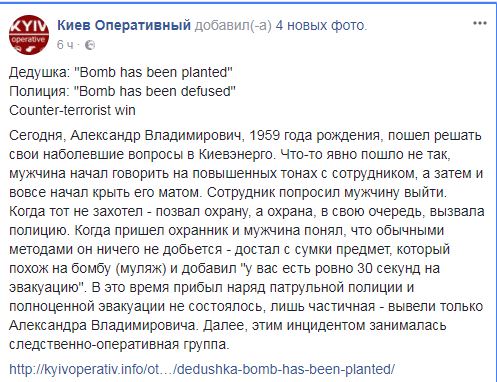 В сообщении сказано, что 59-летний мужчина по имени Александр Владимирович пошел в офис "Киевэнерго" для "решения насущных вопросов". Затем между ним и сотрудниками компании произошла ссора.