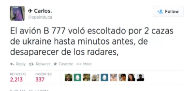 17 июля 2014 года в твиттере @spainbuca, якобы принадлежавшем испаноязычному диспетчеру киевского аэропорта Борисполь, появилась запись: несколько украинских военных самолётов якобы сопровождали малазийский Боинг MH-17 незадолго до его исчезновения с радаров.
