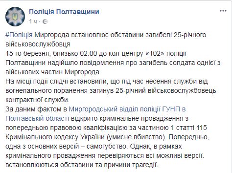 "Около 2:00 (четверга) в колл-центр "102" полиции Полтавщины поступило сообщение о гибели солдата одной из воинских частей Миргорода", - заявили в полиции.