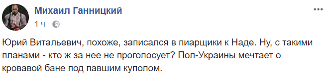 "Юрий Витальевич, похоже, записался в пиарщики к Наде. Ну, с такими планами - кто ж за нее не проголосует? Пол-Украины мечтает о кровавой бане под павшим куполом", - пишет журналист Михаил Ганницкий.