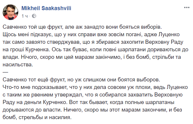 Вот так бывает, когда полные шарлатаны дорываются до власти. Ничего, скоро мы этот маразм закончим, и без бомб, стрельбы и насилия", - пишет Михо.