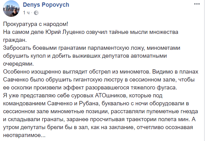 Я уже представляю себе суровых АТОшников, которые под командованием Савченко и Рубана, буквально с ночи оборудовали в сессионном зале минометные позиции, расставляли пулеметные гнезда и складывали гранаты, заранее просчитывая траектории полета мин. А утром депутаты брели бы в зал, как на заклание, отчетливо осознавая неотвратимое...", - описывает предполагаемую бойню журналист Денис Попович.