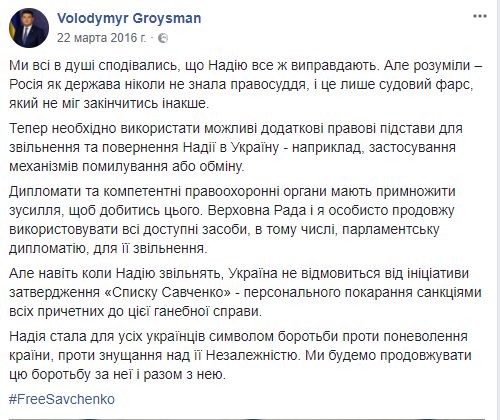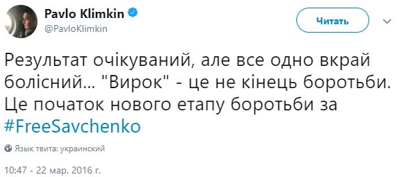 Глава МИД Павел Климкин после вынесения приговора Савченко написал в Twitter, что "это еще не конец" борьбы за украинку.