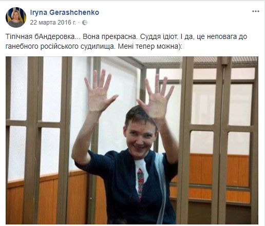 Ирина Геращенко в своем Facebook восхищалась Савченко и называла российского судью "идиотом", а летчицу - "типичной бандеровкой".