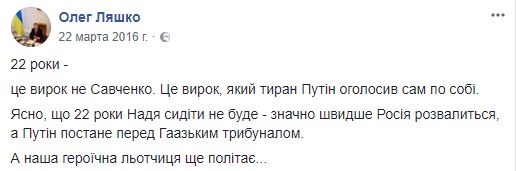 Лидер радикалов Олег Ляшко обещал на своей странице в соцсети, что "наша летчица еще полетает".