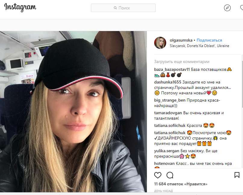 По снимку видно, что 51-летняя Ольга Сумская сфотографировалась в поезде в окрестностях Славянска, что в Донецкой области, если верить геотаргетингу. На ней бейсболка, кожаная куртка, а на лице не видно следов косметики.