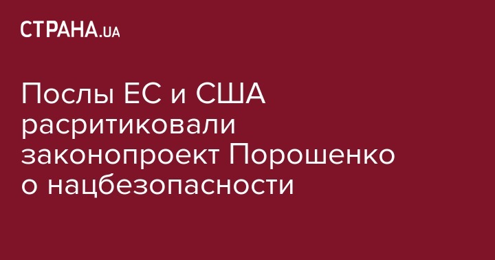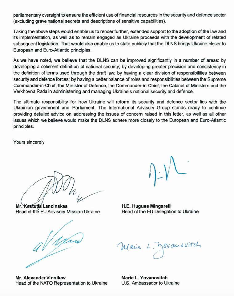 Посол США Мари Йованович, глава Представительства ЕС в Украине Хью Мингарелли, глава Консультативной миссии Европейского Союза в Украине Кястутис Ланчинскас и глава Представительства НАТО в Украине Александр Винников раскритиковали президентский закон о национальной безопасности. Об этом они сообщили в письме адресованном Петру Порошенко.