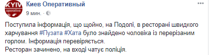 "Поступила информация, что только что на Подол е, в ресторане быстрого питания "Пузата Хата" был найден мужчина с перерезанным горлом. Информация проверяется.Ресторан закрыт на входе дежурит полиция", - говорится в сообщении.