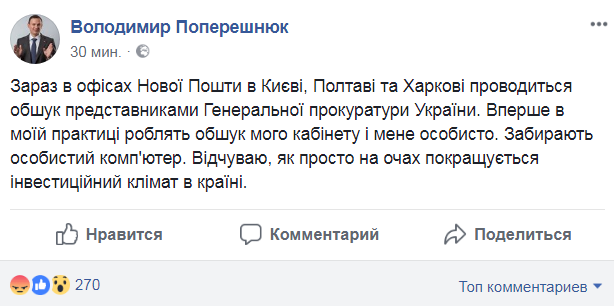 "Сейчас в офисах Новой Почты в Киеве, Полтаве и Харькове проводится обыск представителями Генеральной прокуратуры Украины. Впервые в моей практике делают обыск моего кабинета и меня лично. Убирают личный компьютер. Чувствую, как прямо на глазах улучшается инвестиционный климат в стране", – написал он.