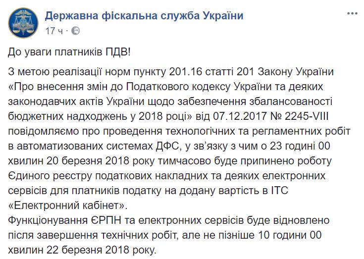 Государственная фискальная служба с 20 по 22 марта 2018 года временно приостановит работу единого реестра налоговых накладных и некоторых других электронных сервисов, разработанных для плательщиков налога на добавленную стоимость (НДС).