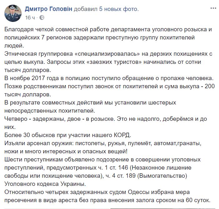 Сотрудники полиции задержали в Одессе четверых членов этнической организованной преступной группы, которая занималась похищением людей. Об этом сообщил начальник Главного управления Нацполиции в Одесской области Дмитрий Головин на своей странице в Facebook.