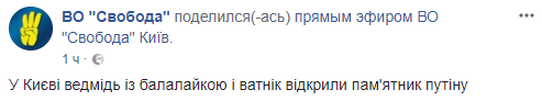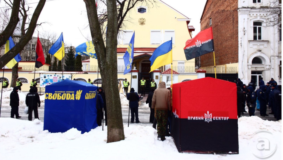 Видео акции у посольства РФ на Воздухофлотском проспекте в Киеве. обнародовала пресс-служба ВО "Свобода" на своей странице в Facebook.