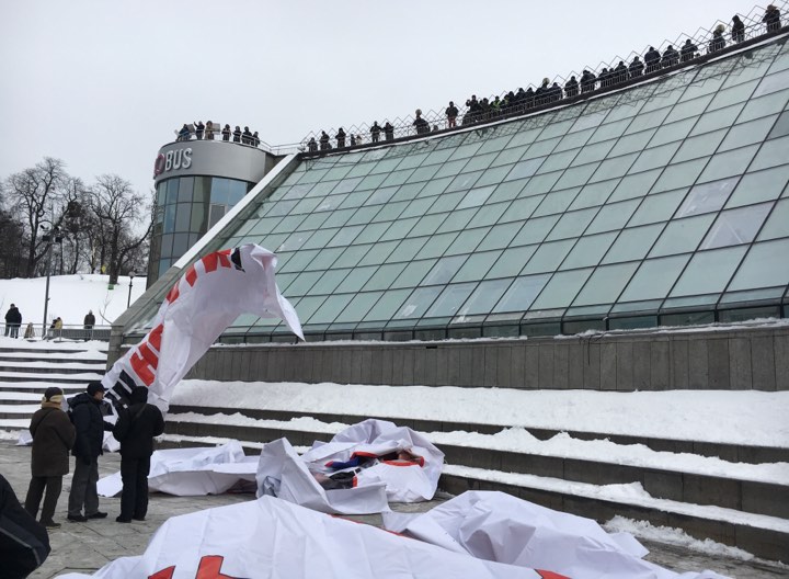 12:35  Плакаты провокационного и "антисаакашвилиевского" характера провисели буквально десять минут. На балкон "Глобуса" забрались сторонники РНС, среди них люди в черном камуфляже с надписями "Рух правых сил", и заняли эту территорию. Плакаты спустили вниз, балкон заняла сейчас полиция. Баннеры разрезают на земле ножами.