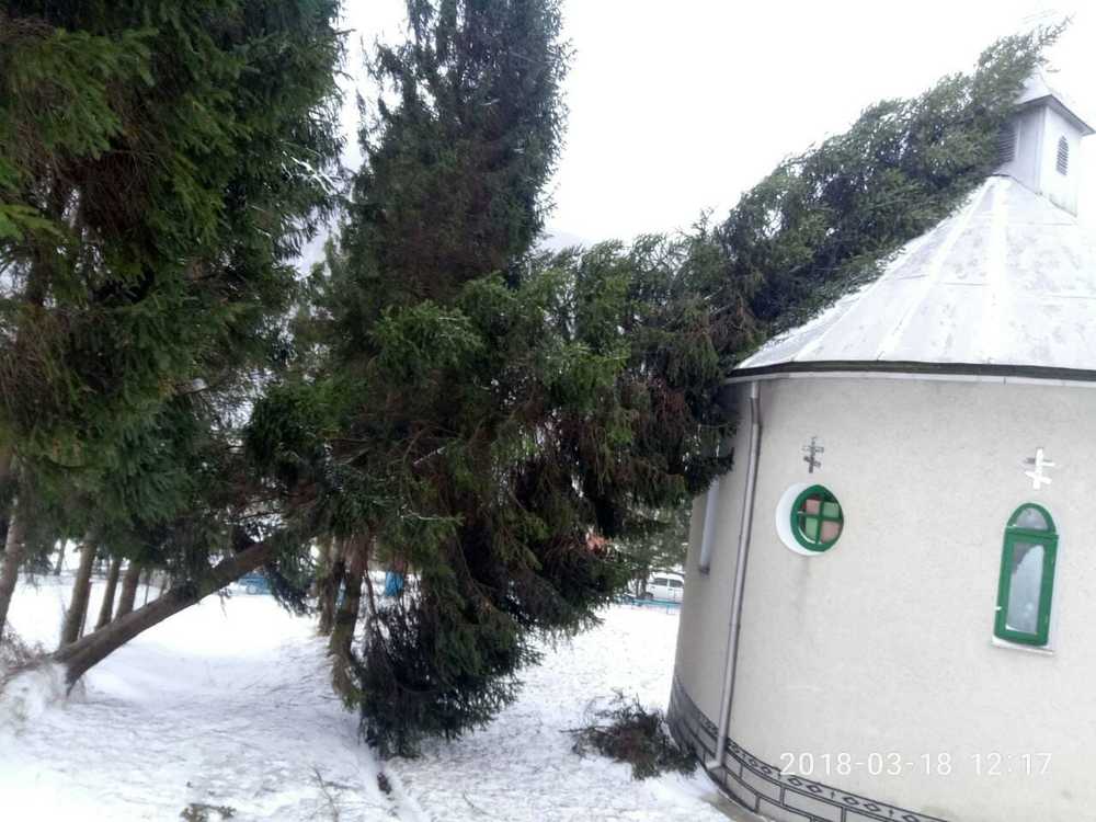 На Закарпатье из-за непогоды ель рухнула на церковь