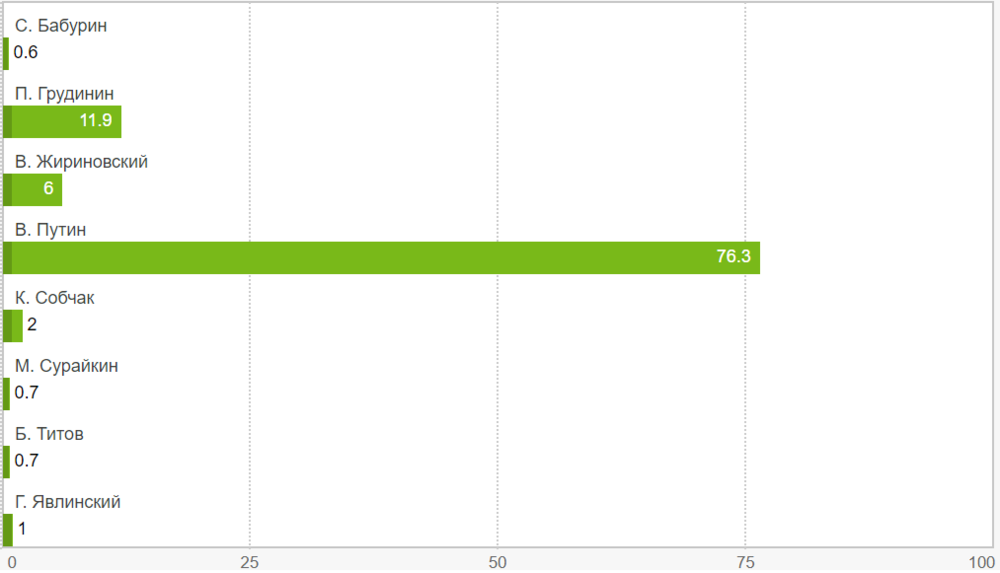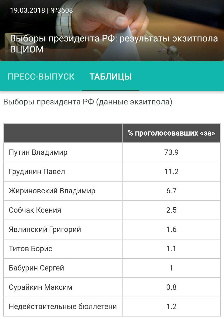 По результатам экзитпола ВЦИОМ, президентом Российской Федерации в первом туре избран Владимир Путин (73,9% голосов).