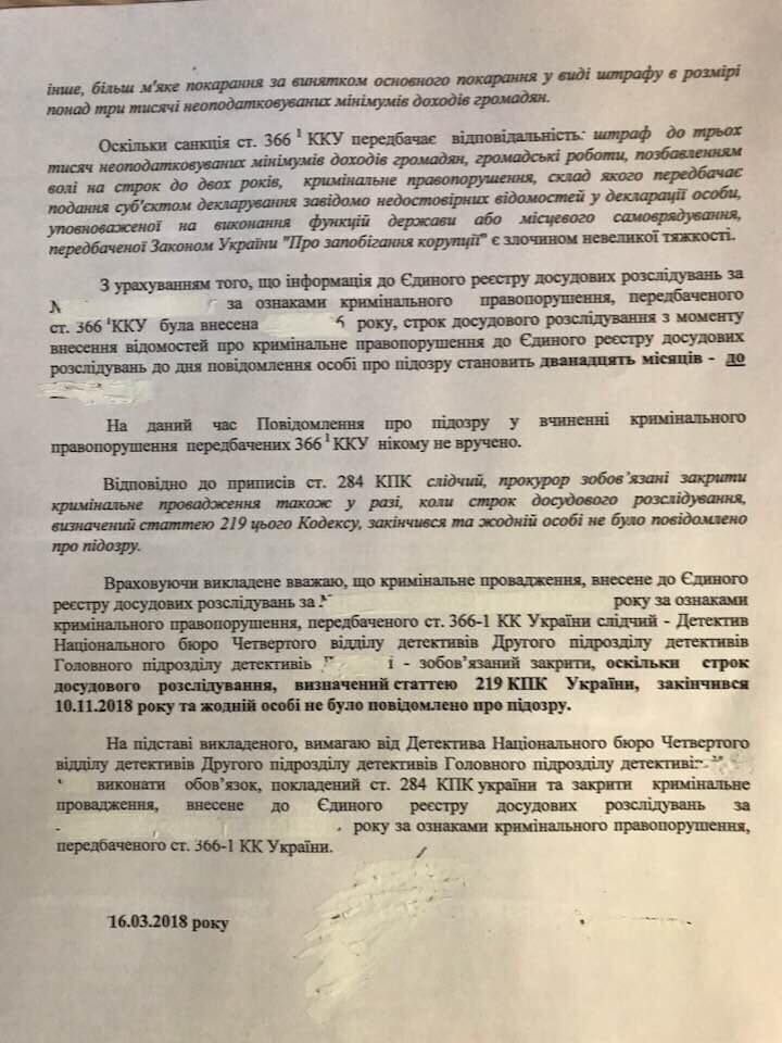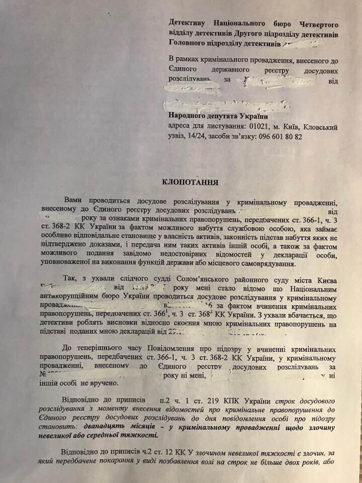Персональные данные адвокат затер, но отталкиваясь от даты (10.11.2017) нетрудно понять, о каком нардепе идет речь. Это Игорь Мосийчук. Дело по незаконному обогащение. было открыто 10 ноября 2016 года, перечень статей - те же, что указаны в документе, который приводит Курчин.