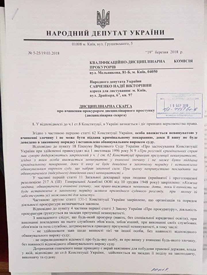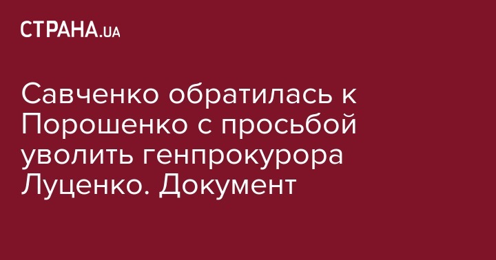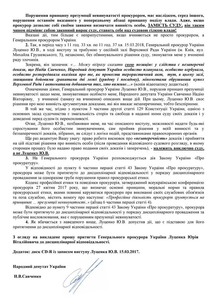 "В жалобе к Президенту Украины я прошу подать в Верховную Раду письменное представление о предоставлении согласия на увольнение Луценко Ю.В. с должности генерального прокурора, за нарушение присяги Прокурора; после получения указанного выше согласия Верховной Рады Украины - освободить Луценко Ю.В. от должности генерального прокурора Украины за нарушение присяги прокурора", - написала Савченко.