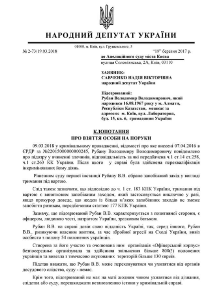 Суд сегодня рассмотрит апелляцию Рубана, Савченко берет его на поруки