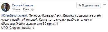 Сегодня, 21 марта, в Печерском районе Киева, на бульваре Леси Украинки, избили и ограбили мужчину, который вышел из подъезда на улицу. Об этом сообщил местный житель Сергей Быков на своей странице в Facebook, который и вызвал "скорую" помощь.