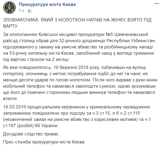 Шевченковский райсуд Киева избрал для 32-летнего уроженца Узбекистана меру пресечения в виде содержания под стражей на 2 месяца. Он подозревается в покушении на умышленное убийство и разбойничье нападение на 53-летнюю киевлянку.