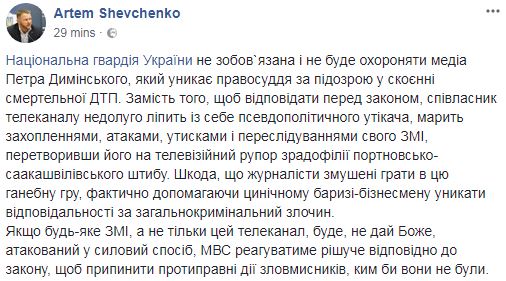 "Национальная гвардия не обязана и не будет охранять медиа Петра Дыминского, который избегает правосудия по подозрению в совершении смертельного ДТП. Вместо того, чтобы отвечать перед законом, совладелец телеканала лепит из себя псевдополитического беглеца, грезит захватами, атаками, притеснениями и преследованиями своего СМИ, превратив его в телевизионный рупор "зрадофилии портновски-саакашвиливського штаба", - написал Шевченко.