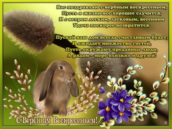 Пусть в Вербное Воскресение уйдут все печали и невзгоды, пусть исчезнут из жизни обиды, пусть станет чистой и светлой душа, пусть будет добрым мир вокруг, пусть Бог пошлёт крепкое здоровье и верное счастье.
