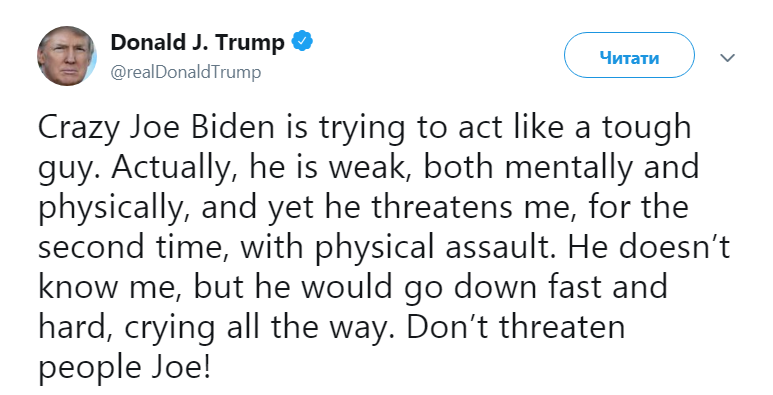 "Безумный Джо Байден пытается вести себя как крутой парень. В действительности он слаб, как психически, так и физически, и всё же он угрожает мне, во второй раз, физическим нападением. Он меня не знает, но он упал бы у меня быстро и сильно, и всё время плакал бы. Не угрожай людям, Джо!" — написал Дональд Трамп.