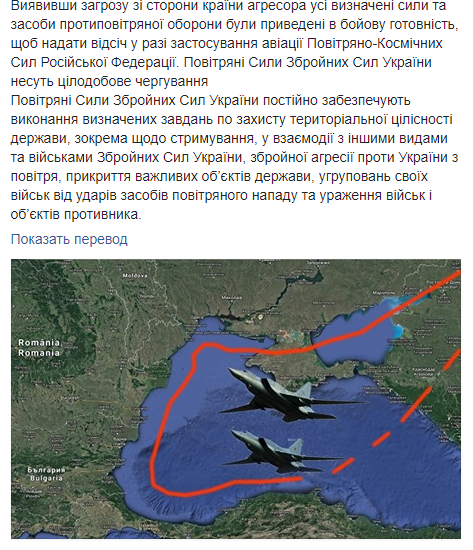 "Истребительная и бомбардировочная авиация страны агрессора осуществляла вылеты с аэродромов Шайковка, Крымск и Бельбек с максимальным приближением к государственной границе Украины, линии разграничения между материковой частью Украины и АР Крым, а также с приближением до 40 км к береговой линии со стороны Черного моря с дальнейшим полетом вдоль побережья Румынии, Болгарии и Турции. Кроме того, группа дальних стратегических бомбардировщиков-ракетоносцев Ту-22 с полным боекомплектом в сопровождении пары истребителей Су-30 РФ осуществила полет в воздушном пространстве АР Крым, Азовского и Черного морей по отработке определенных условных заданий по нанесению ударов", - говорится в сообщении.