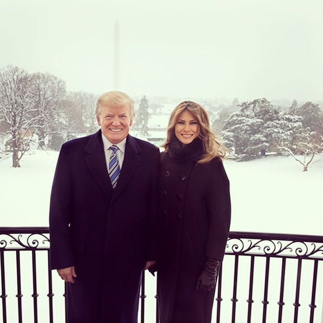 На снимке Мелания и Дональд держатся за руки на фоне заснеженного двора Белого дома, они выглядят счастливыми и улыбаются.