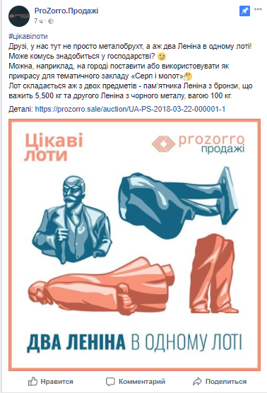Сервис публичных и государственных закупок ProZorro выставил на аукцион два памятника Ленину, выполненных из металла и снесенных в рамках декоммунизации. Об этом сообщается на Facebook-странице сервиса.