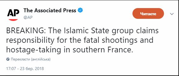 "Исламское государство" взяло на себя ответственность за смертельную стрельбу и захвата заложников на юге Франции", - говорится в сообщении.