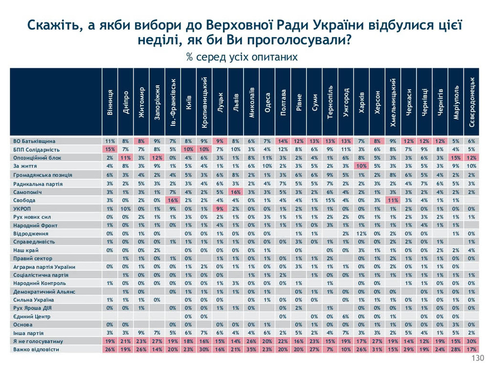 Если бы выборы в Верховную Раду состоялись в ближайшее воскресенье, то больше всего голосов набрали бы ВО "Батькивщина", БПП "Солидарность", "Оппозиционный блок", "За жизнь" и "Гражданская позиция". О