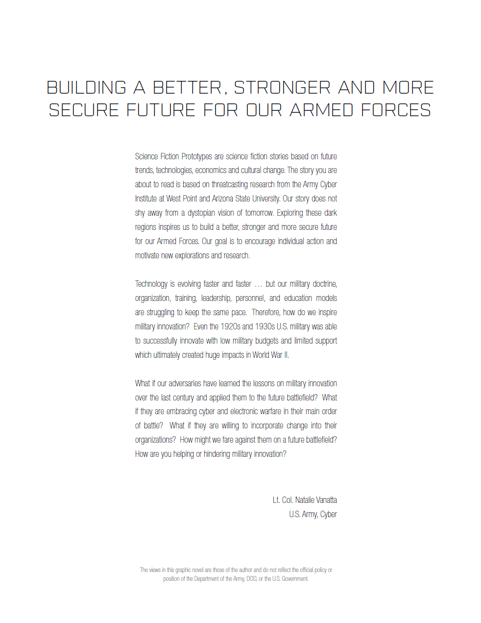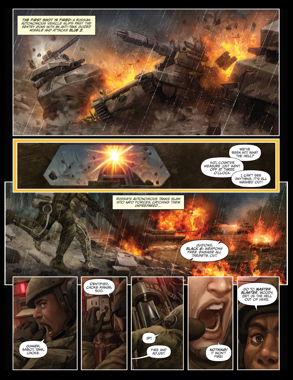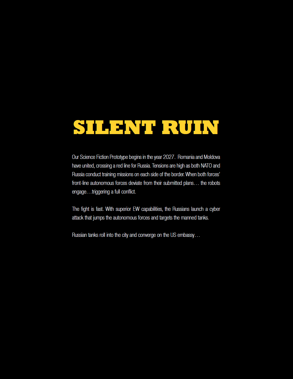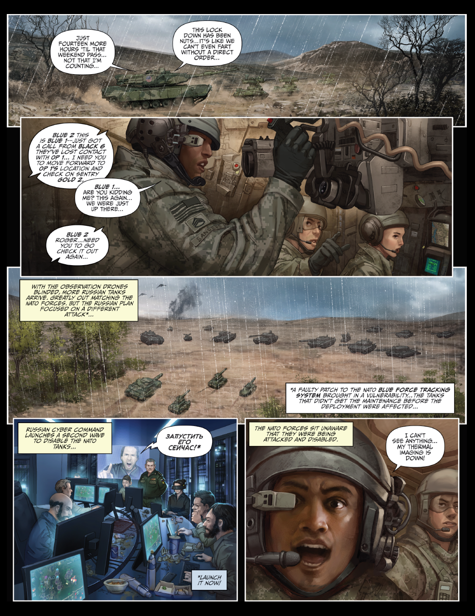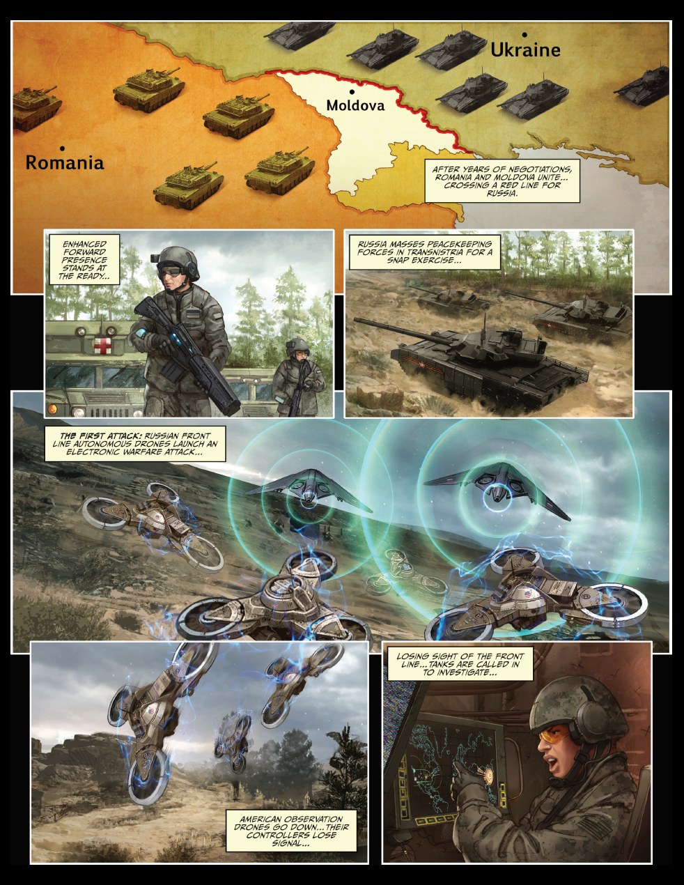 Комиксы показывают ущерб, который могут нанести кибертехнологии войскам, а также последствия их применения. В комиксе "Тихое крушение" рассматривается сценарий объединения Румынии и Молдавии. В ответ на образование этого союза Россия начинает масштабные учения на границе. На территории объединившихся стран учения начинают и войска НАТО.