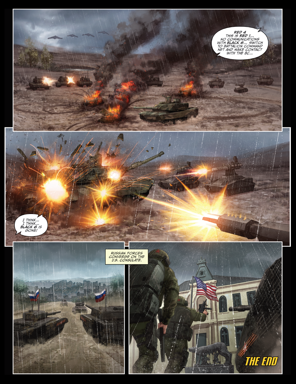 История заканчивается началом военного конфликта, в котором российские войска сначала используют системы радиоэлектронной борьбы, выводя из строя беспилотные системы НАТО, а затем российская сторона нарушает работу системы связи и обмена данными.