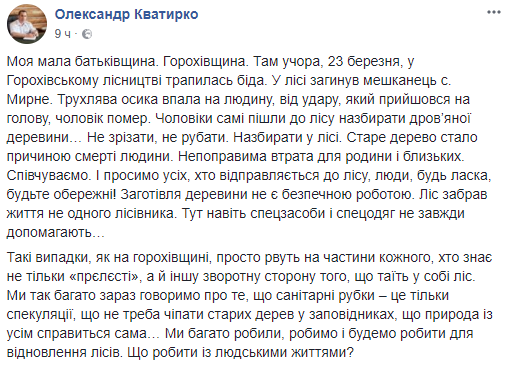 "В Гороховском лесничестве случилась беда. В лесу погиб житель с. Мирное. Трухлявая осина упала на человека. От удара, который пришелся на голову, мужчина скончался. Мужчины сами пошли в лес собрать хворост. Не срезать, не рубить. Насобирать в лесу", - написал Кватирко.