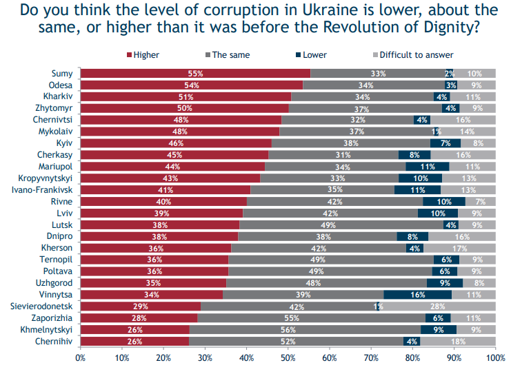Так все в основном согласны, что в Украине усилилась коррупция со времен Евромайдана. Количество тех, кто считает, что со взятками с 2014 года стало только хуже, колеблется от 55% до 26%.
