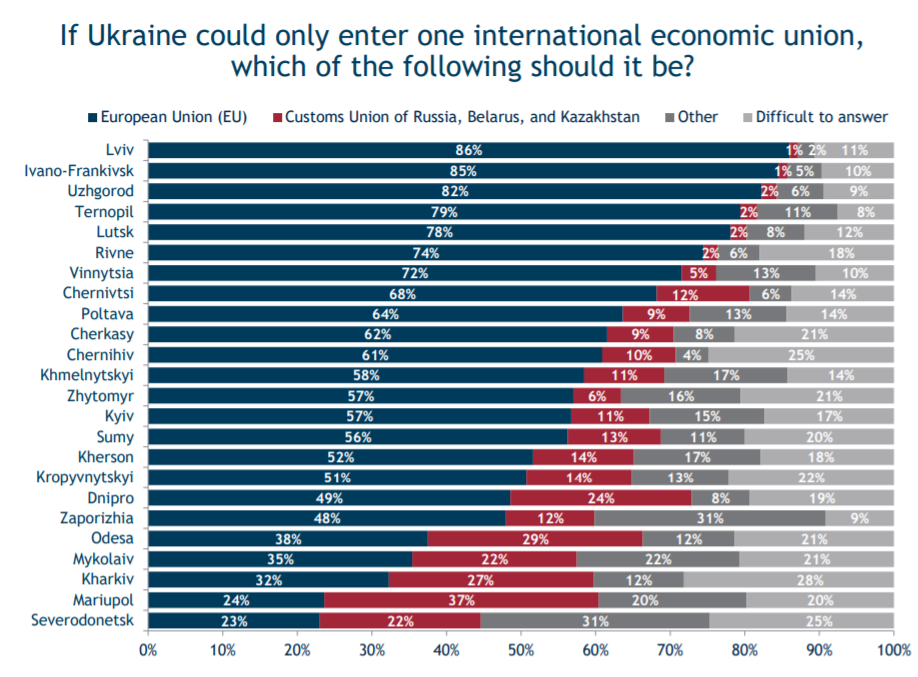 Вступить в Таможенный союз с Россией (и не идти в Североатлантический Альянс) больше всего хотят на юго-востоке страны: в Мариуполе, Северодонецке, Харькове, Одессе, Запорожье, Днепре и Николаеве.