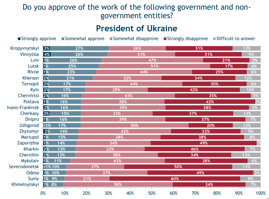 Самые оптимистичные города – это Львов, Винница и Кропивницкий, где видят перспективу 24% опрошенных. Меньше всего оптимистов – в Херсоне, Северодонецке и Мариуполе (по 10%), Одессе (9%) и Николаеве (8%).