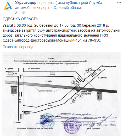 "С 08:00 26 марта по 17:00 30 марта 2018 временно закрыто движение автотранспортных средств на автомобильной дороге общего пользования национального значения Н-33 Одесса – Белгород-Днестровский – Монаши- (М-15/км 78 + 950)", - говорится в сообщении.